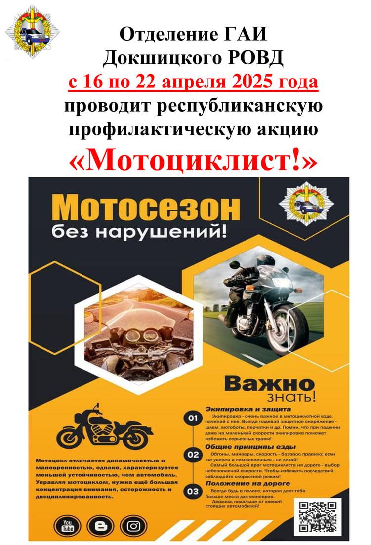 Отделение ГАИ Докшицкого РОВД с 16 по 22 апреля 2025 года проводит Республиканскую профилактическую акцию "Мотоциклист!"