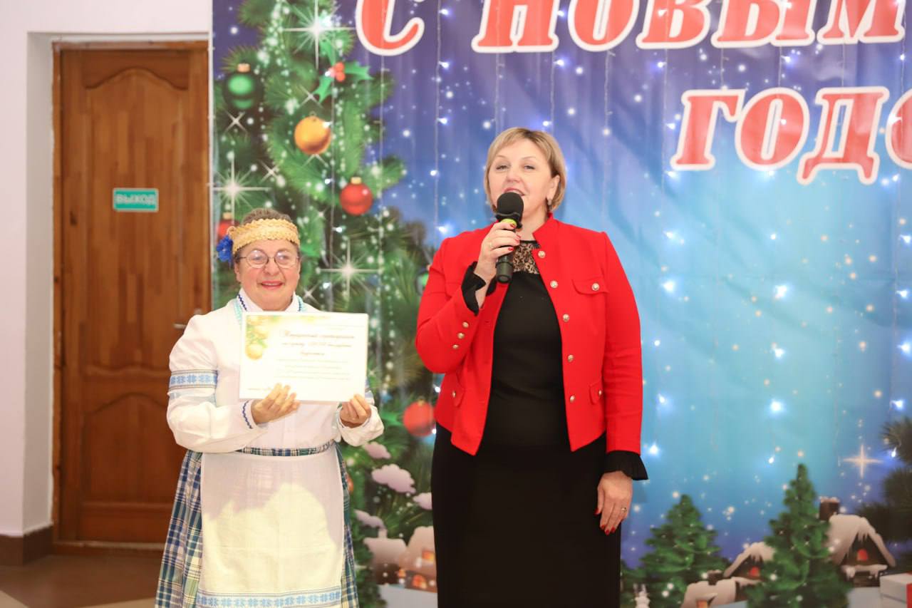 С новогодними пожеланиями к участникам торжества обратилась заместитель председателя райисполкома Оксана Полочанина и вручила подарочный сертификат отделению дневного пребывания для граждан пожилого возраста ТЦСОН.