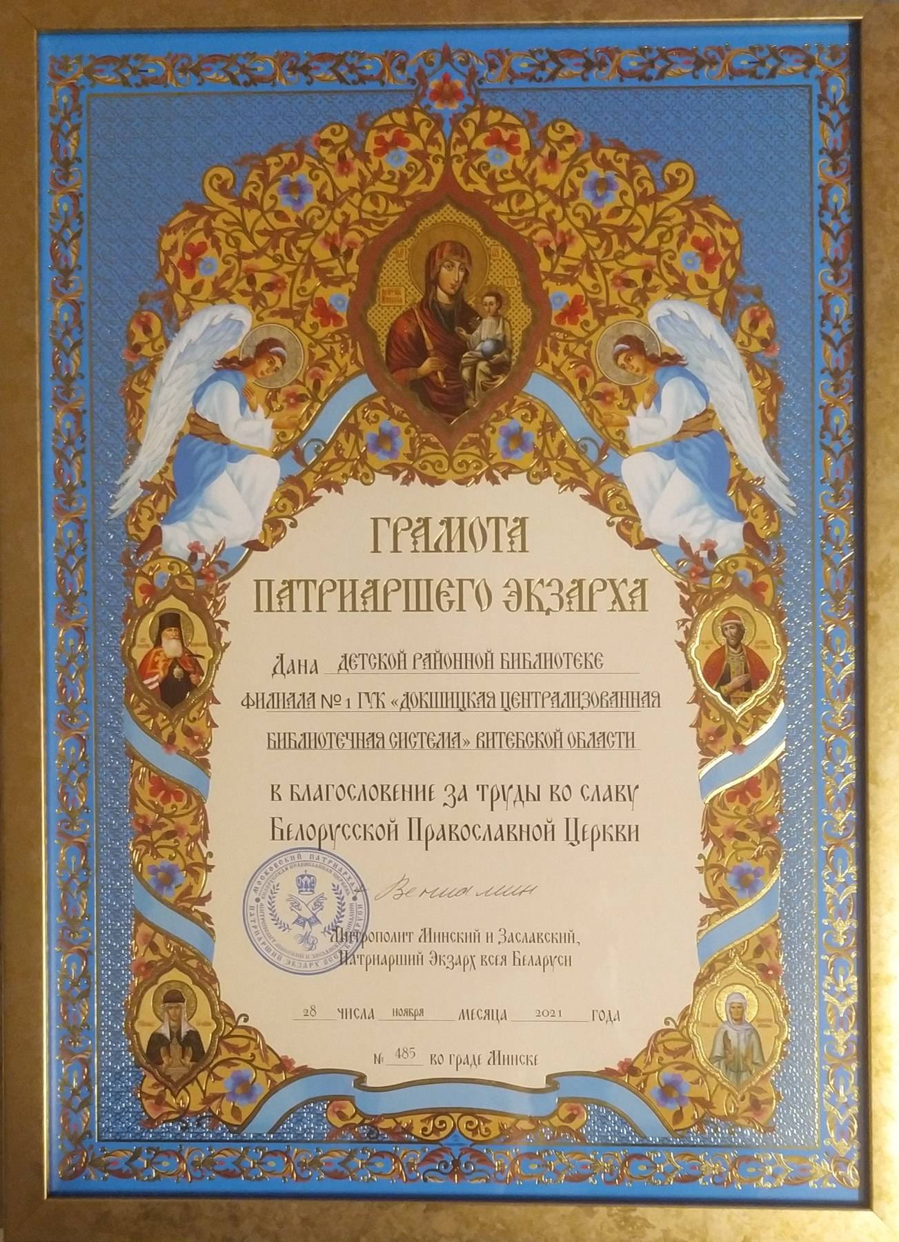 Приятно отметить, что в VII Республиканском конкурсе «Библиотека – центр духовного просвещения и воспитания» Докшицкая детская районная библиотека заняла 1 место в номинации «История Православия родного края». Церемония награждения победителей конкурса состоялась 28 ноября 2021 в Храме-памятнике в честь Всех святых и в память о жертвах, спасению Отечества нашего послуживших